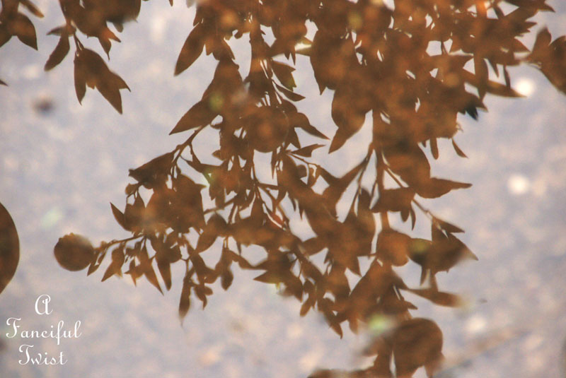 Admiring orange tree silhouettes in puddles.