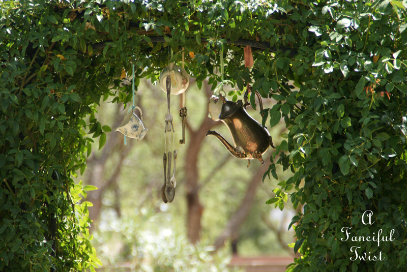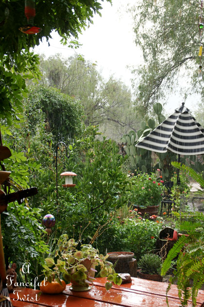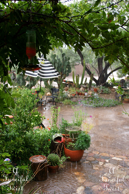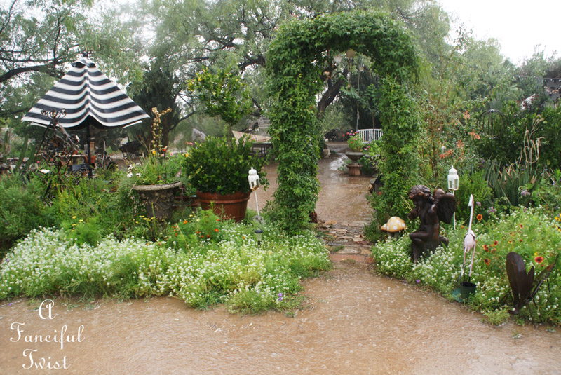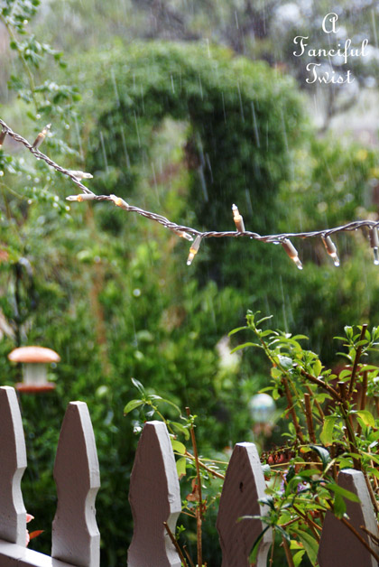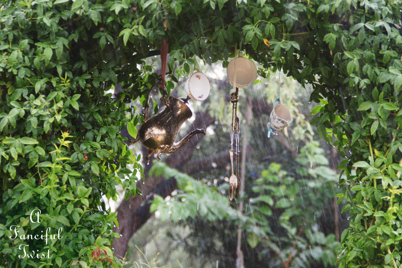 Oh this, this is just pure rain and hail magic! I can almost hear the drops chiming on your hanging tea set!! I love that idea!! Swooon and swirls and cheers and frolics to your magical garden world!!!! : )