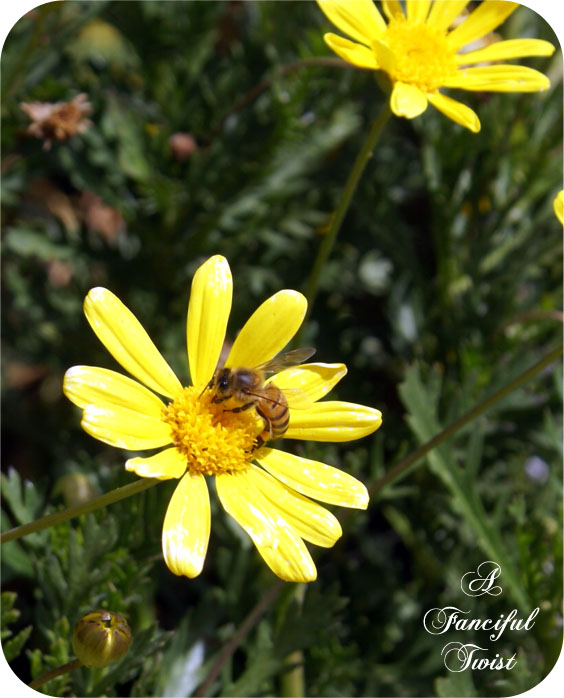 And … however did you manage to catch the bee in mid-flight, working hard, little legs heavily laden with pollen? What a fab photo!