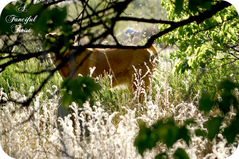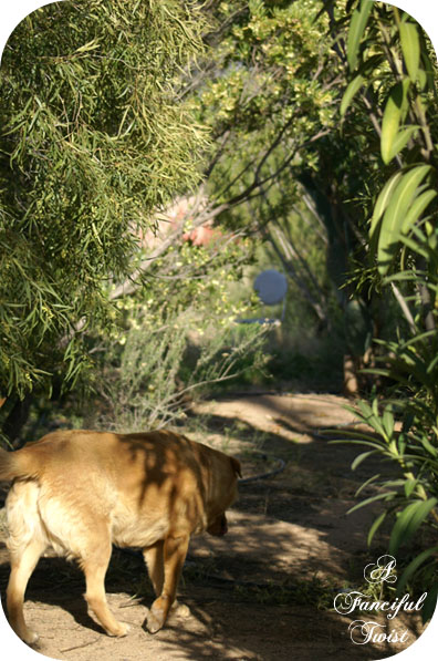 See, I veered again, sheeesh. Okay I was telling you about strolling with my pooch. Our favorite place to stroll and play and hideout, is through a little corridor of trees and shrubs. It is easy to get lost in your child-like imagination right in there…
