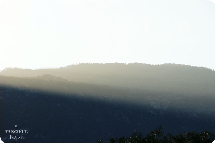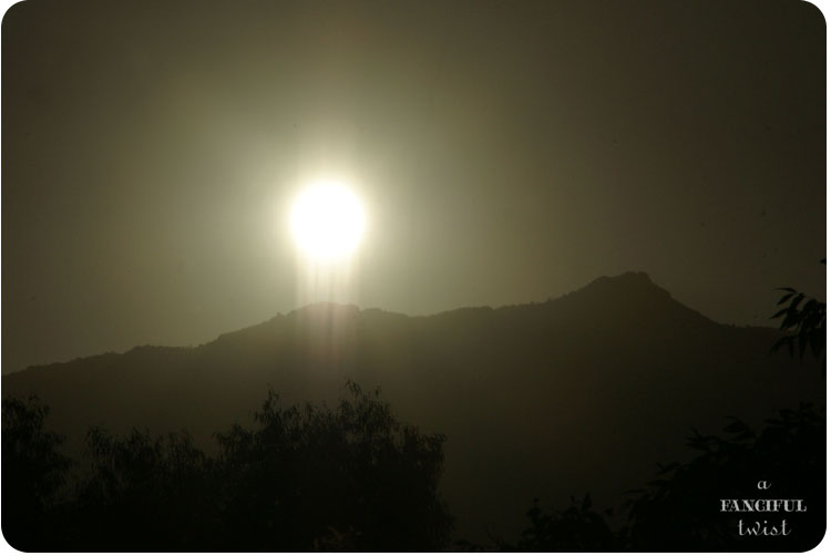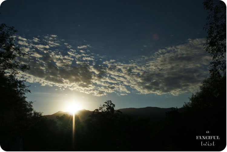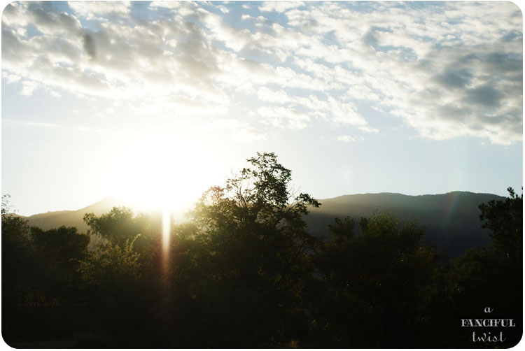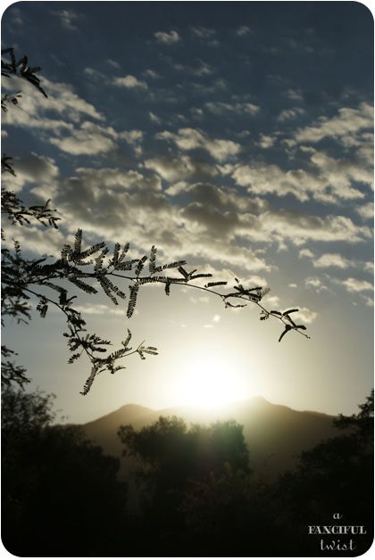 On the first day of October, I found myself outside before the sun began its rise over the mountains.  I was standing outside of the cottage, checking on some pumpkin vines, when a sun burst inched over the Santa Catalina mountains….