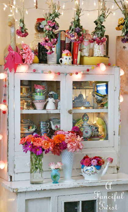 Just like the person who commented just before me, Janet, my favourite picture is the one with all those pretty flower bouquets sitting on, and drying up above, the hutch. Sigh…