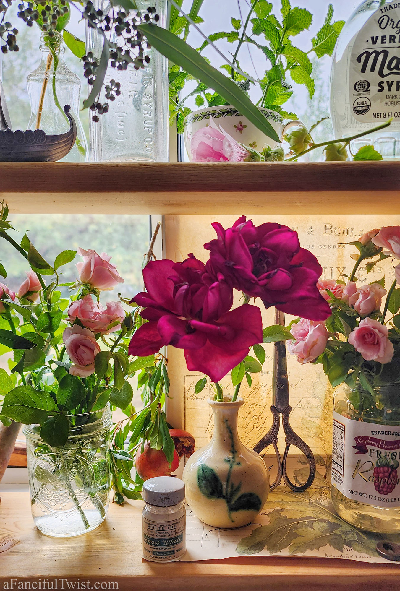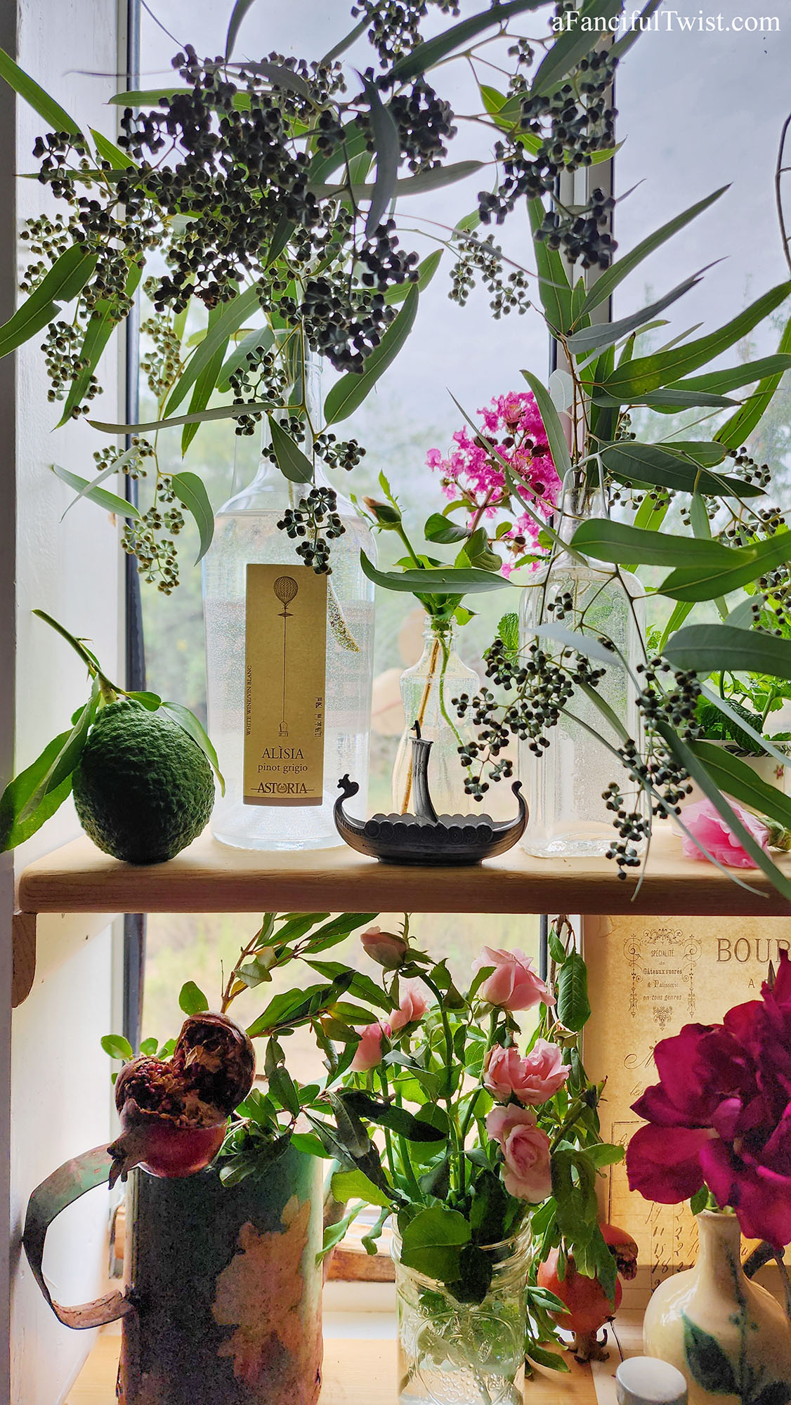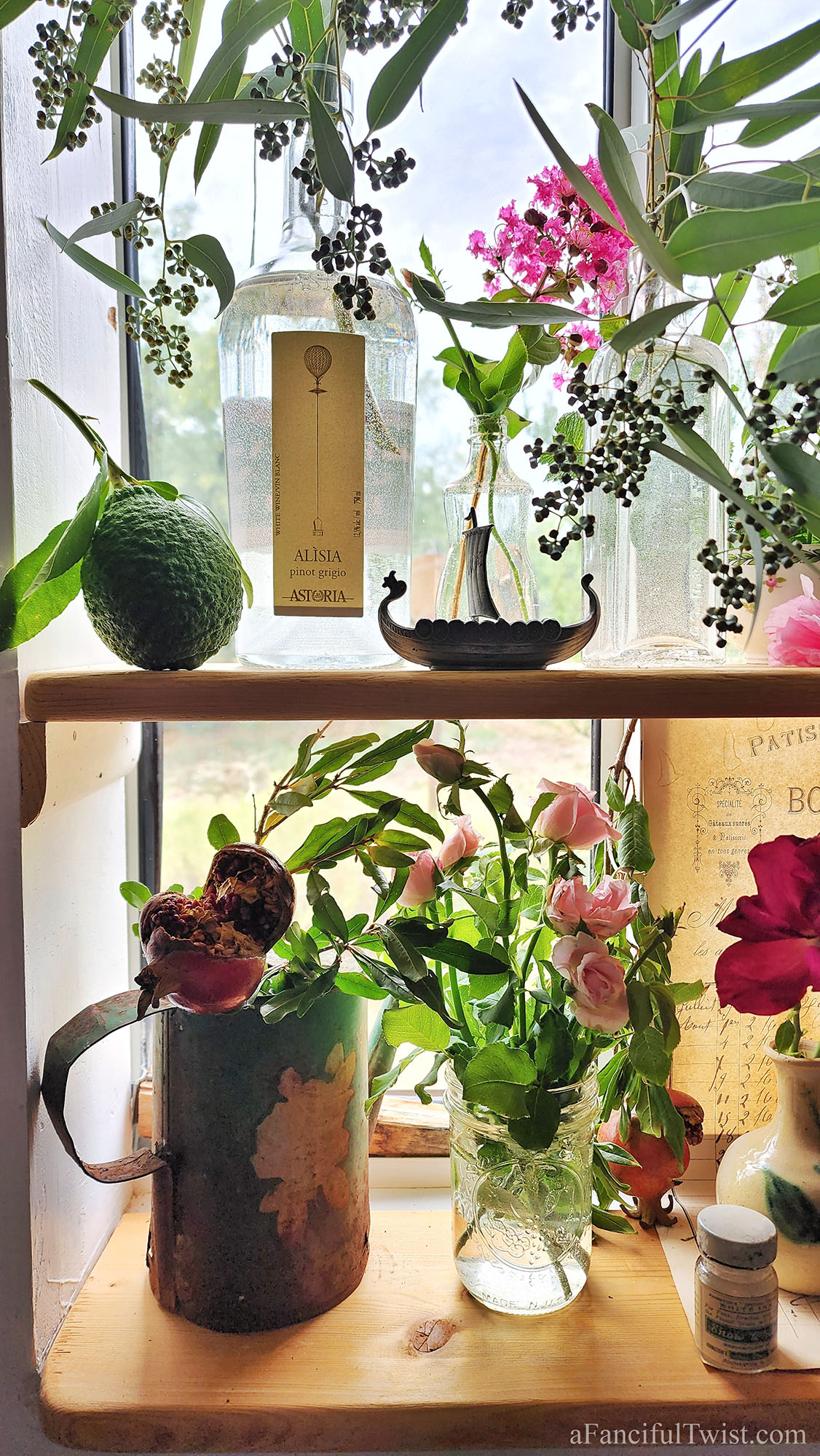 My little window shelf is full of whatever I can find in the garden right now.