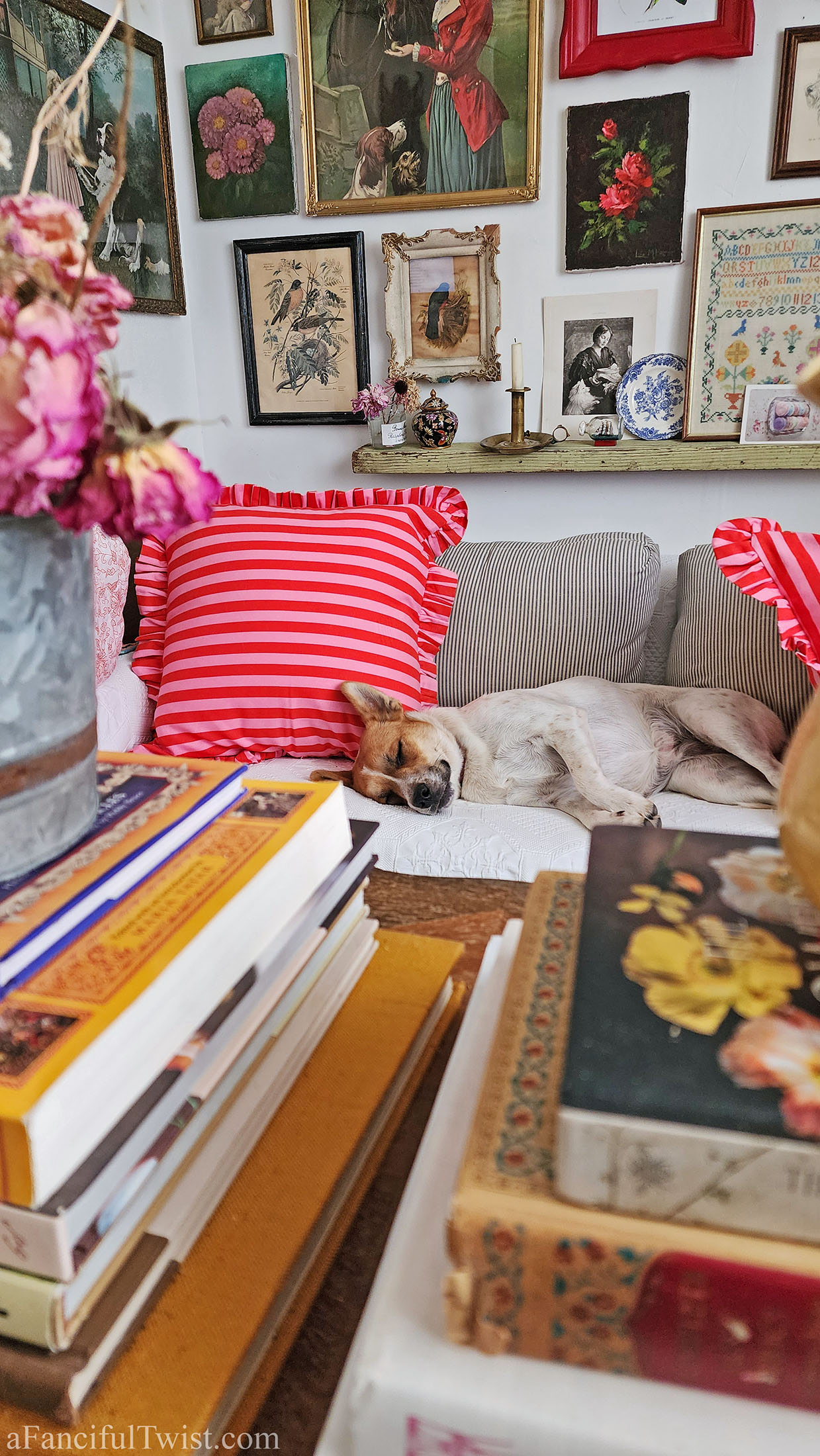 Oh V, if only I could give you a big bear hug. I remember going through my mama’s things. The rush of memories was overwhelming and comforting at the same time. Next week will be 4 years without her and in December it will be 6 years without my daddy. I still think about them everyday and randomly call out to them. I’ll be cleaning and then all of a sudden say, “Daddy, oh daddy†or I’ll say, “Mama…mama†and start to cry a bit. I feel a surge of love fill my heart afterwards. Crazy thing you should mention your allergies. I used to get allergy shots once a week every Saturday morning so I could enjoy my pets when I was a child. I was (am) also allergic to dust. Over the last few years my cat and dust allergies have gotten so terrible. I have an appointment with an allergist coming up so I’m hoping to pinpoint whatever else I’m allergic to because my eyes are constantly swollen and watery and my nose goes crazy too. Agh. I’m also thinking I might be allergic to walnuts because sometime my tongue hurts after I eat them. Not sure though. I love Poppy. She’s just beautiful. How interesting how she sleeps like that with her legs splayed out.