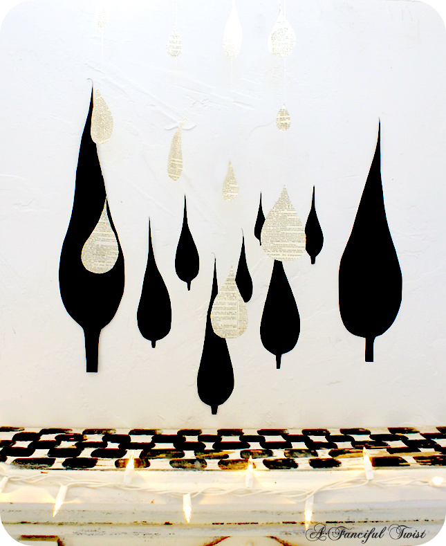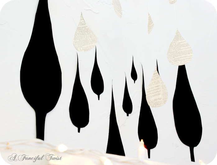ps: I made the wall decals out of thick black drawing paper, and double sided tape. In case you want to put some designs on your own walls 😉 I hung the water drops from thread…