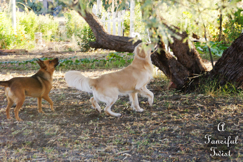 The dogs were madly entranced, barking away.