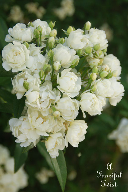Around the gallery grow white climbing roses that bunch up like perfect bouquets.