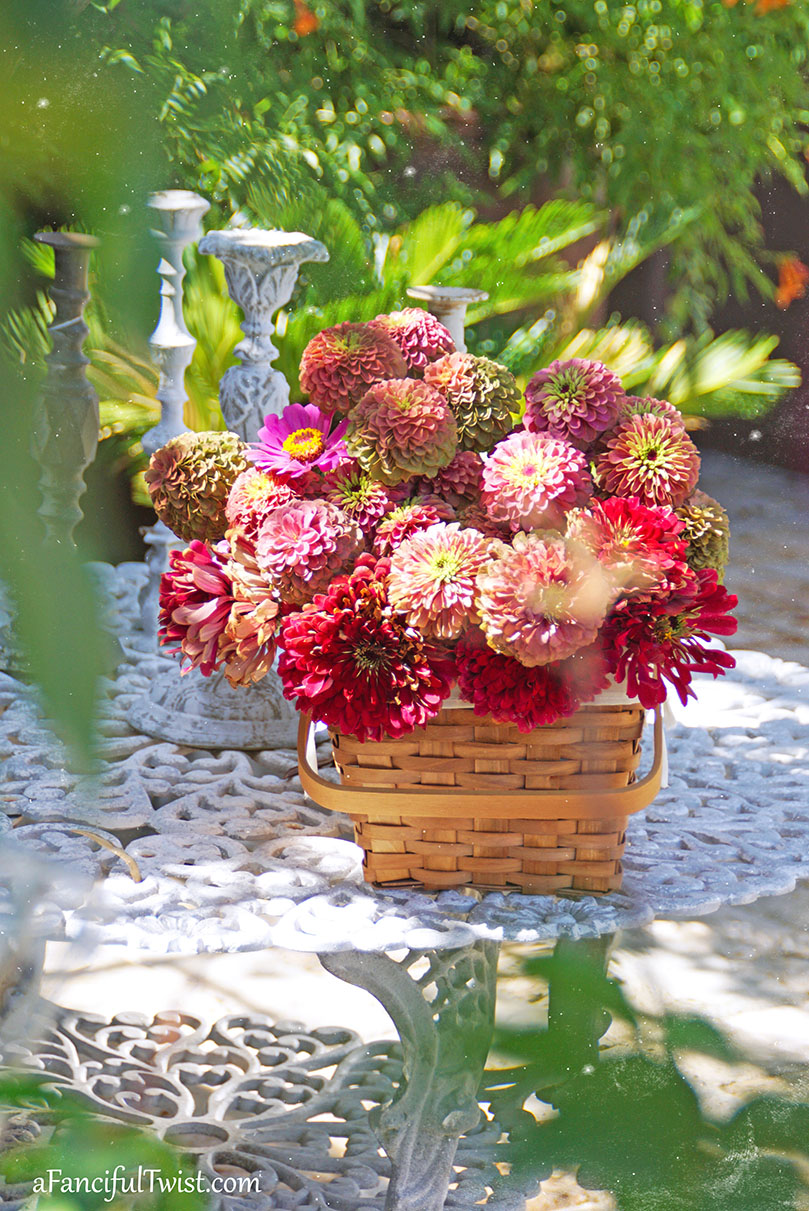 I pick my zinnias in my little basket and run inside when it gets too hot.