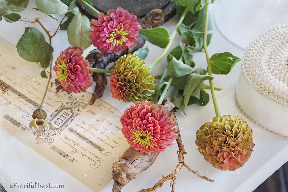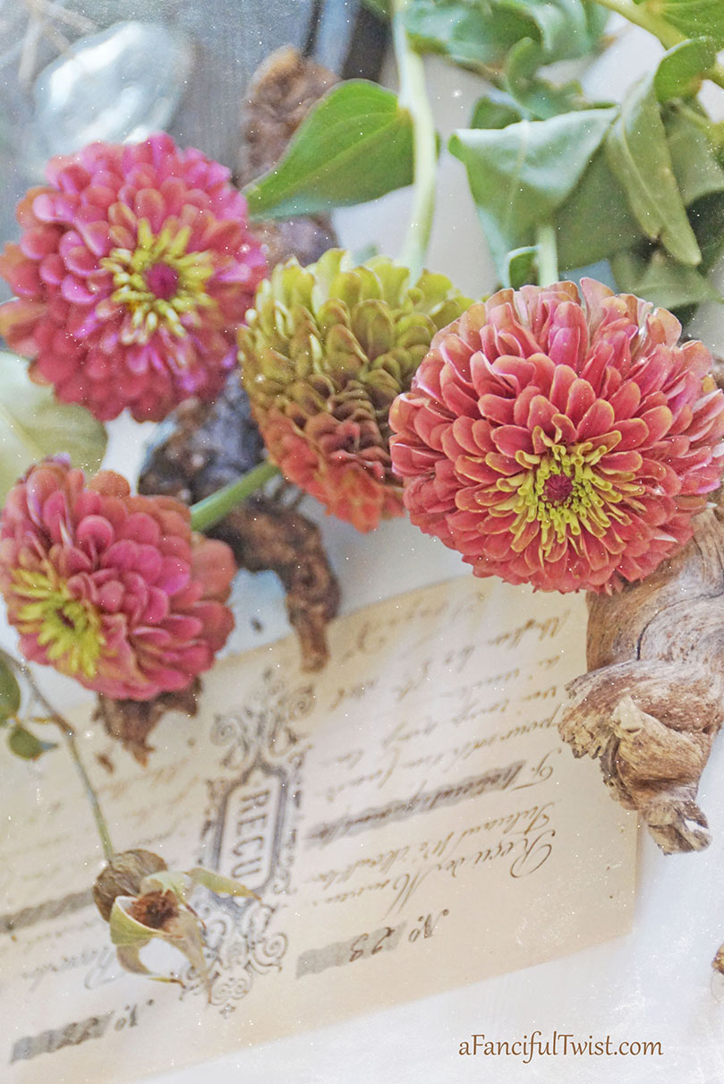 LOVE Zinnia’s and grow them every year. When I saw your bunches of them in the beginning my first thought was they looked like the pinecone flowers you made. I love those pinecone flowers. That is really cool you saw them in a booth like that. How fun. The pieces of wood look like driftwood, love old pieces of wood like that
