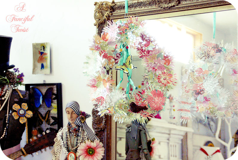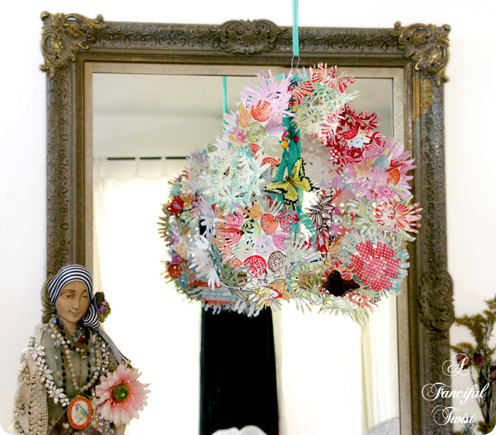 As I said, this little paper flower contraption looks like a wreath in my photos, but it really is not because it has 4 surrounding wires covered in flowers, more like a chandelier.