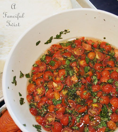 I brought lots and lots of crazy delicious tomatoes from my garden (why are they so intensely delicious when home grown?) and started with my red wine vinaigrette, with cherry tomato and basil bruschetta.