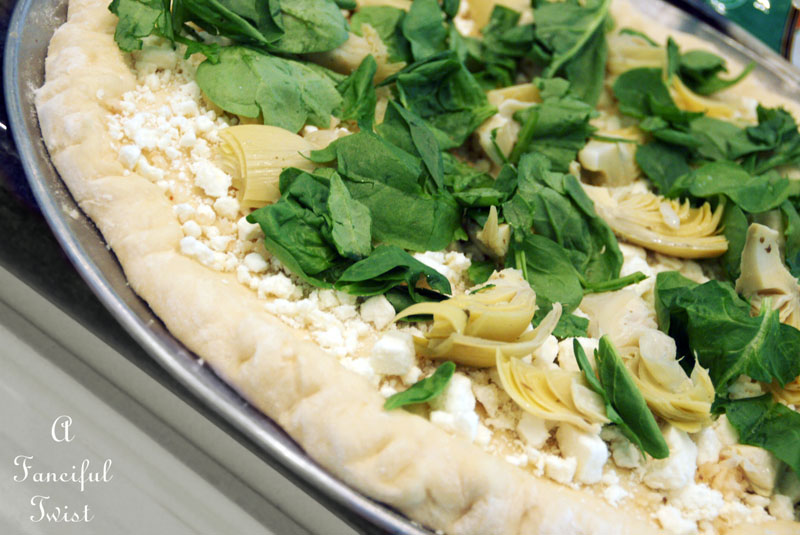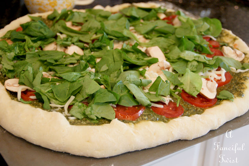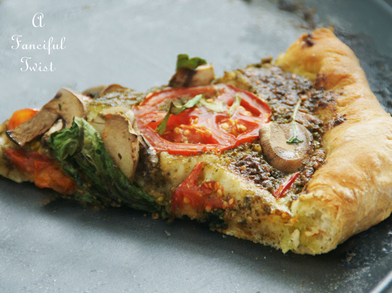 Sis requested cheeseless pesto pizza (oh ya, I made a huge container of pesto to bring with me as well), with large tomatoes from my garden, spinach, and mushrooms…
