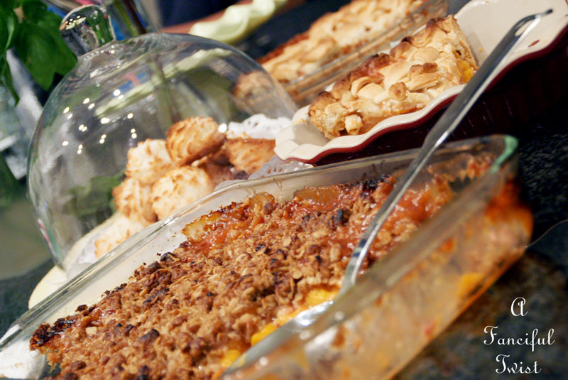 Peach crisp, peach pie, coconut macaroons, cake, cupcakes and ice-cream.