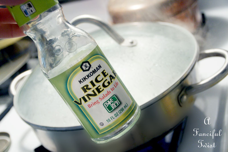 Fill your pan with water, and put in a slurp of rice vinegar or white vinegar.