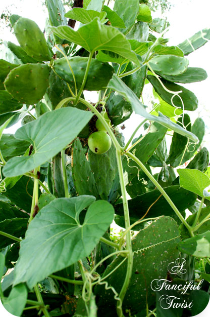 I love pumpkin trees! One of my dearest friends, Shelley, has a pumpkin farm and she always ends up with one! I am soo enjoying how alike our pumpkin and gourds and basil look even though I am in rain drenched Wisconsin! It is magic. I send you star wishes and delight. Blessings.
