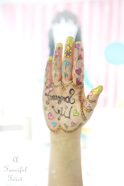 How exciting. Congratulations! And yes, I do write on my hand but I’m afraid I’m much more prosaic and not nearly as cute as yours. Mine is generally reminders when I don’t have a notepad handy. But yours is so much prettier, much like that of my granddaughter’s. I can’t wait to show her this. And am definitely looking forward to the Mad Tea Party 2012 coming up SOON!