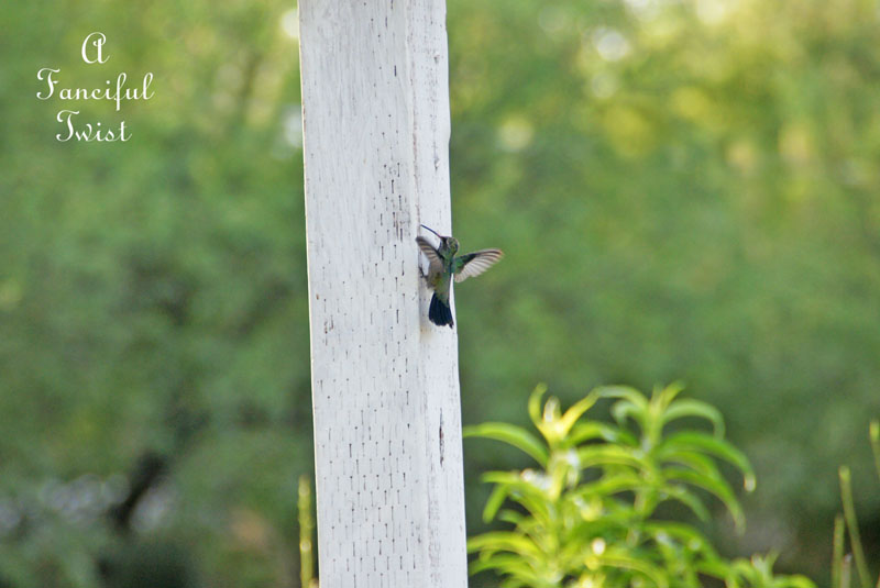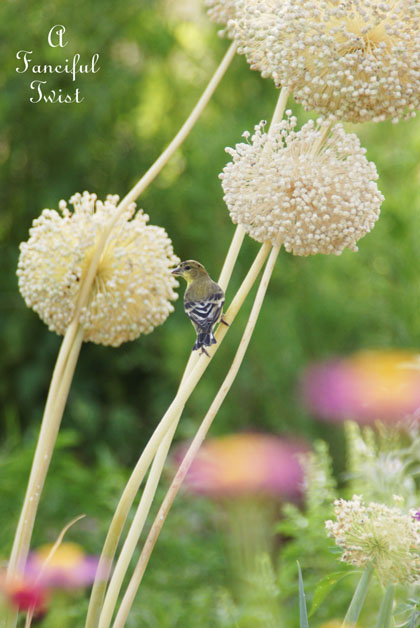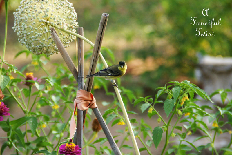 I think that the “hello bird” photo should be made into a postcard! It’s so lovely with the old faded ribbon holding the bamboo and that big round seed head in the background! The awe-inspiring beauty of everyday life in the garden!