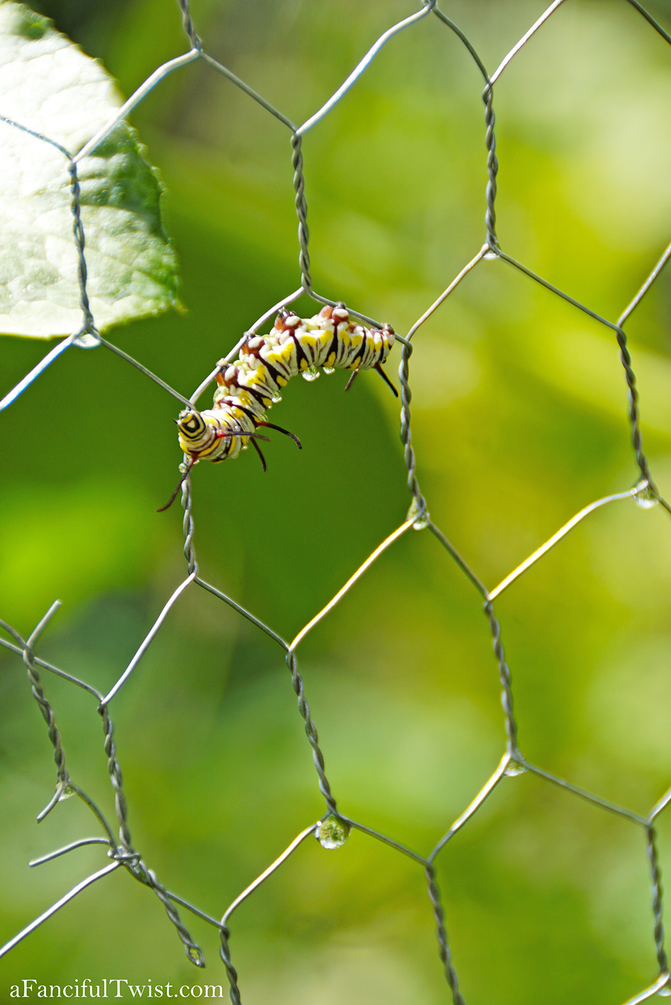 I love to see what I can see out here, and so you can imagine my delight when I somehow spotted a caterpillar crawling around the chicken coop.