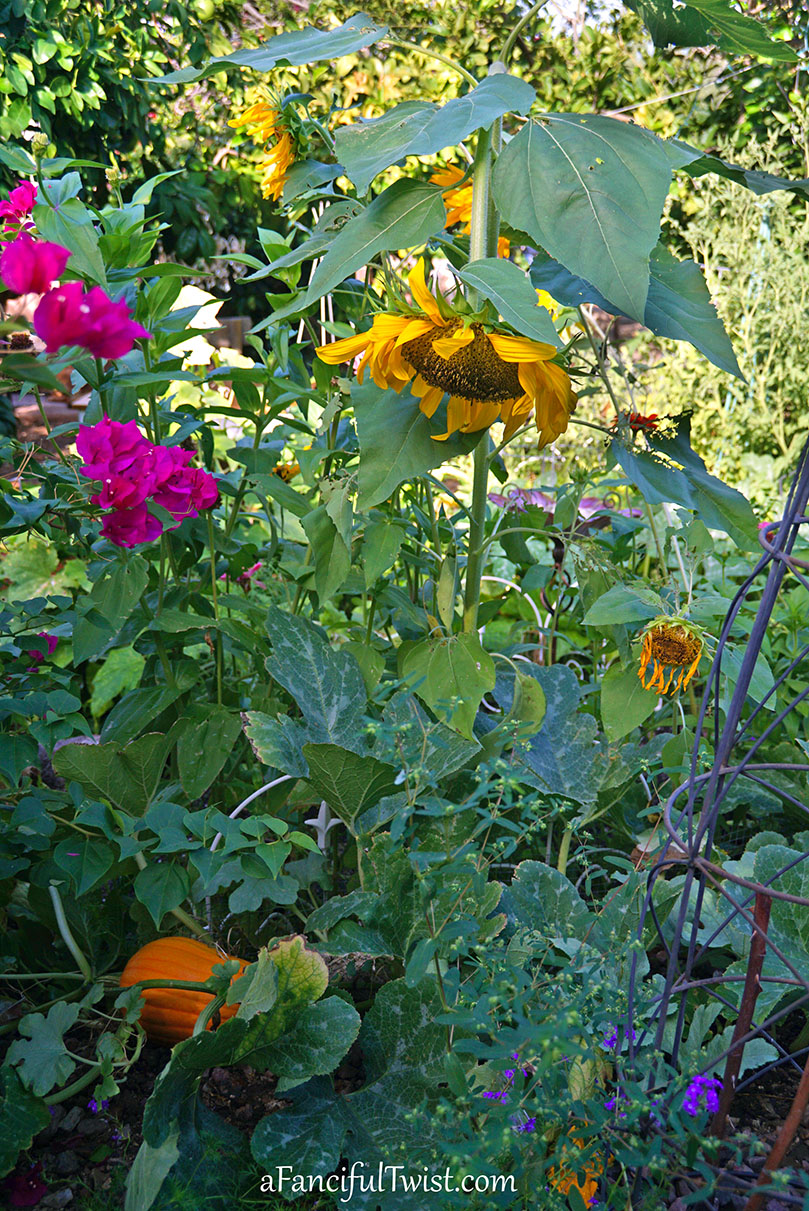 Drooping sunflower necks, secretly looking down at the pumpkins.