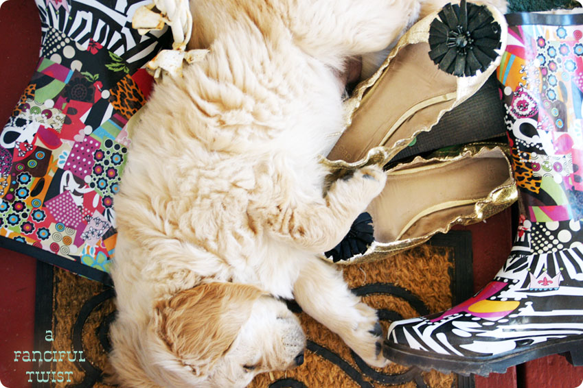 OK, puppy love. He’s still so fluffy cute! And I completely understand his napping location becuase I also adore those gold flats! You have the MOST amazing shoe collection. Where do you shoe shop? Please, please share!