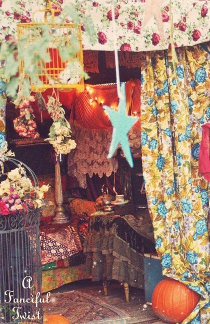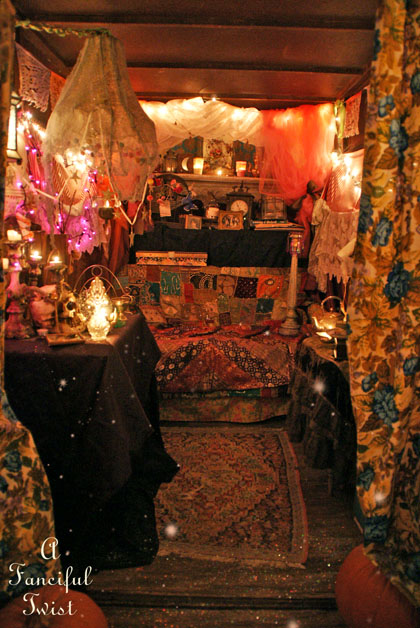 I always love it when you post photos of the Gypsy wagon. It is a world apart from everyday life, so exotic and full of freedom. The care-free Gypsy life, the Bohemian Life, with it’s flamboyantly colorful scarves, drapery, carpeting, all mismatched but perfectly entwined together. And the one-of-a-kind bangles, and lamps, musical instruments played all in a summer’s eve. A get-away in your own back acreage. Like camping out in a spooky backyard long ago as a child. That rare feeling of belonging to another era. You have it all on your Gypsy acreage.
