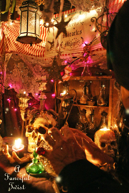 That little area – the gypsy wagon, glittering stars, the lit-up amber-colored courtyard with the candles, vibrant fabrics, burstingly-round pumpkins, and the skulls, too…all of those things speak to my soul. They make me *sigh* and laugh and feel right at home in the magic you’ve created and invited into your home. As always, thanks ever so much for sharing this with us. Seeing this makes the daily routine less monotonous.