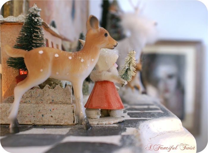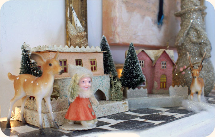 OK…ahem…I have a little glitter Santa Gnome just like yours…only pastel pink and light green…and I am deeply jealous and excited both about your little glitter village! Martha S. has a kit this year at Michaels…but I was thinking it was a bit cheezy…I do love the little villages though…