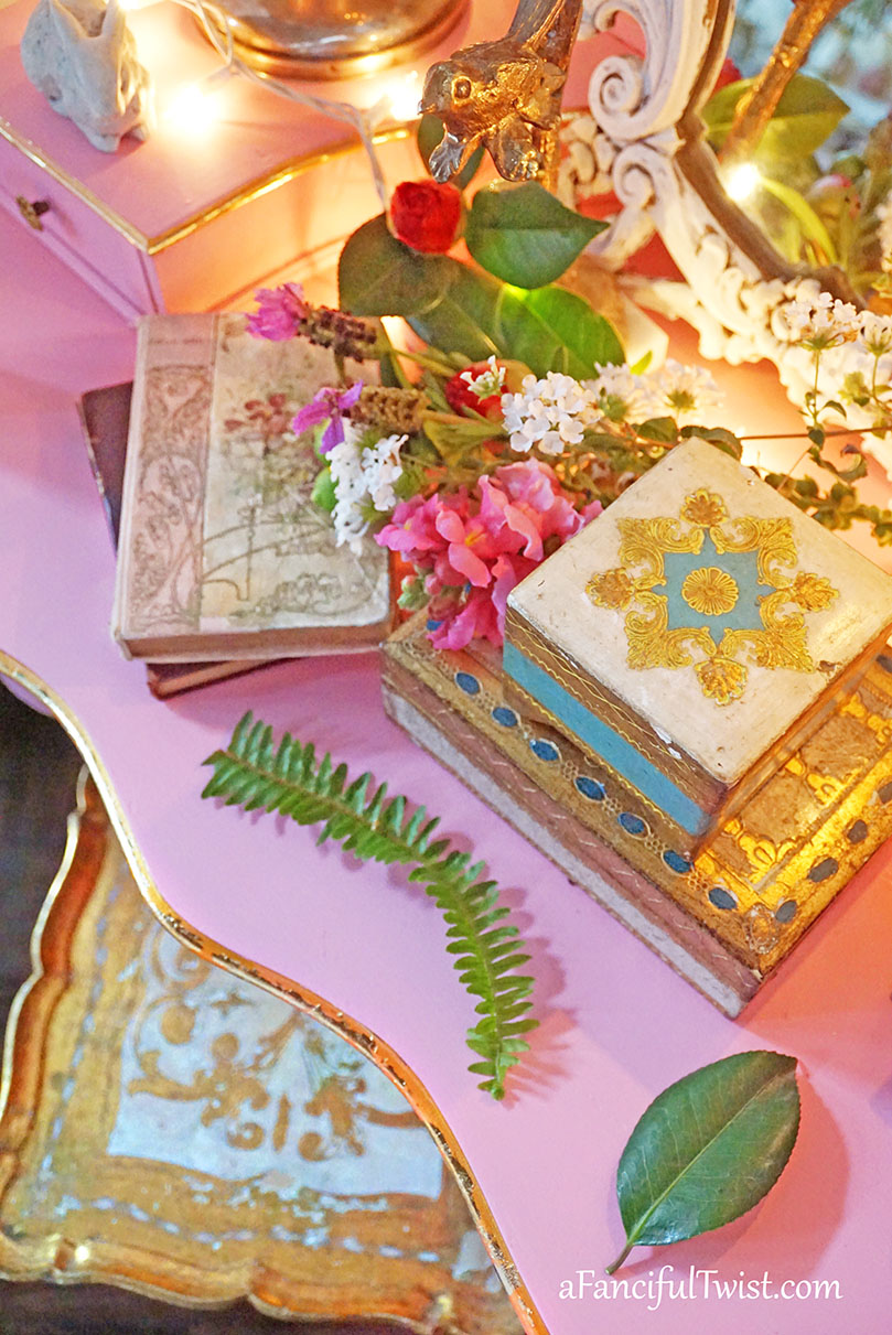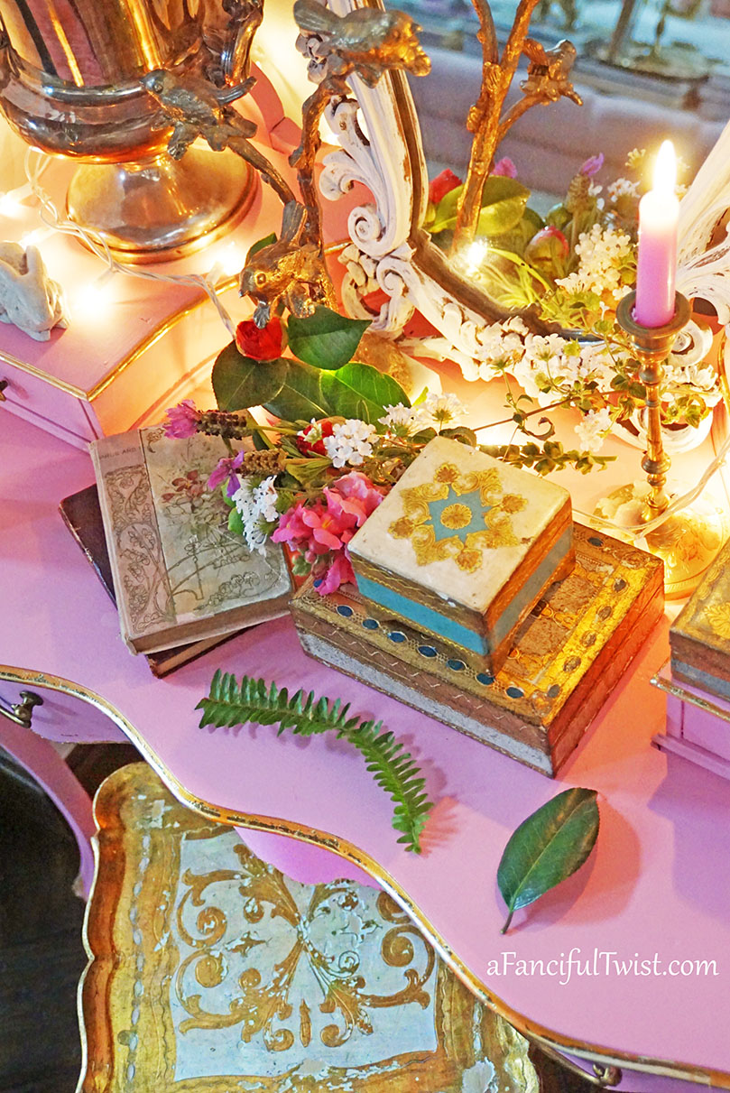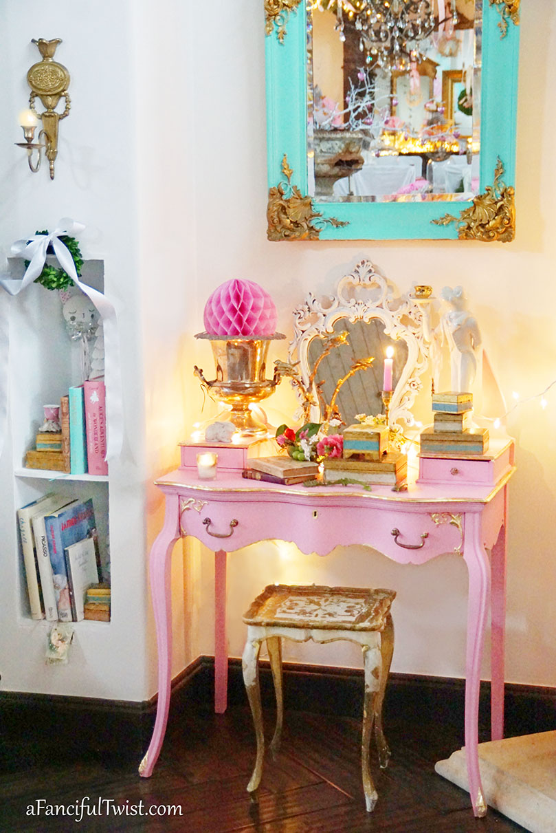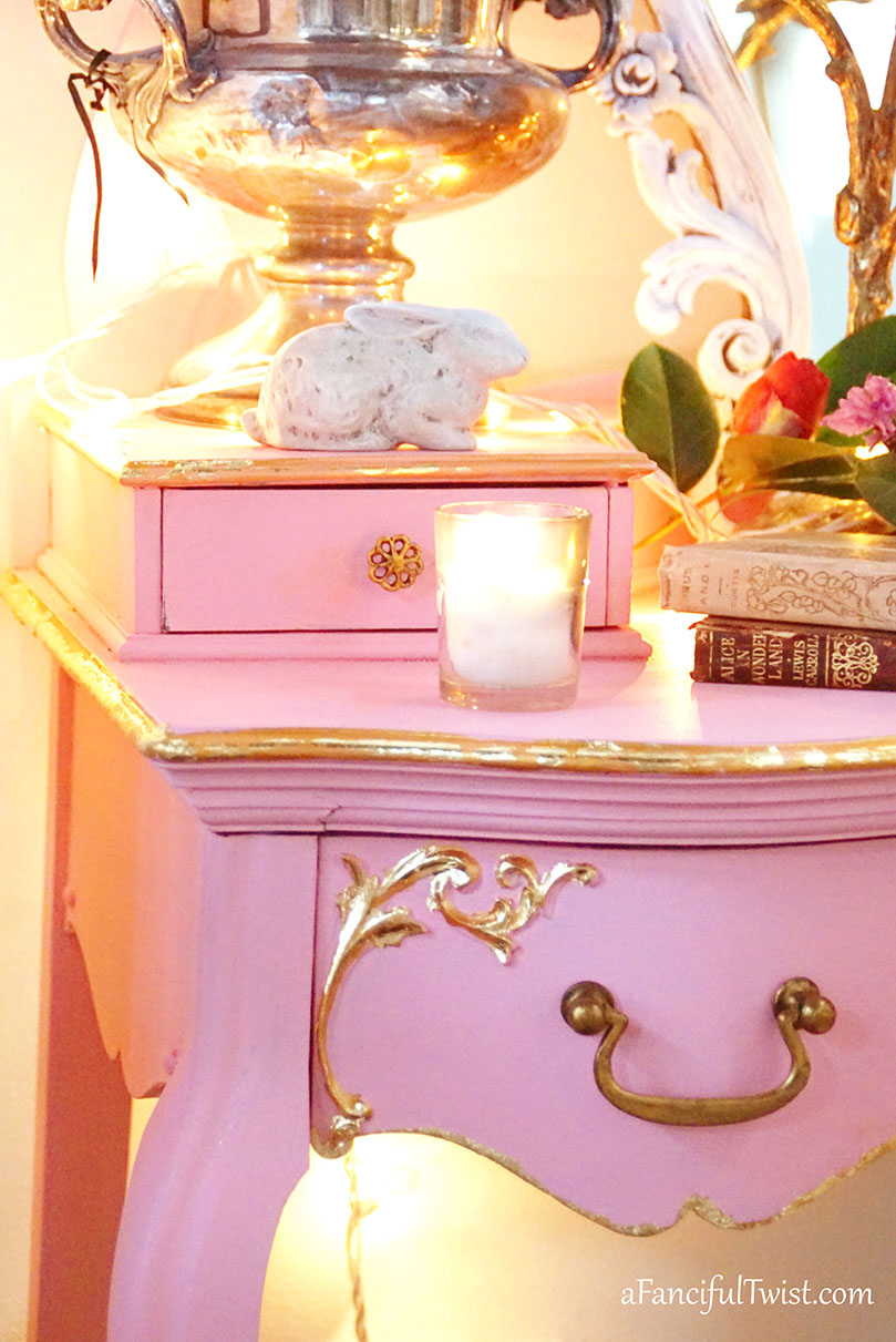 What a lovely pink desk, and I love the gold leafing on it! My daughter has a pink desk, and I think every girl of every age must needs one!