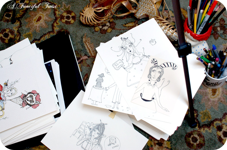 What a lovely insight into your world and the way you work! Thank you for sharing your doodles with us. I have been sending out your postcards and everyone has said how beautiful they are, and I have 4 pinned to 2 pinned to my desk, one on my mantle piece and one in my hall. I love them so much, you are such a talented and inspiring artist of the world 🙂