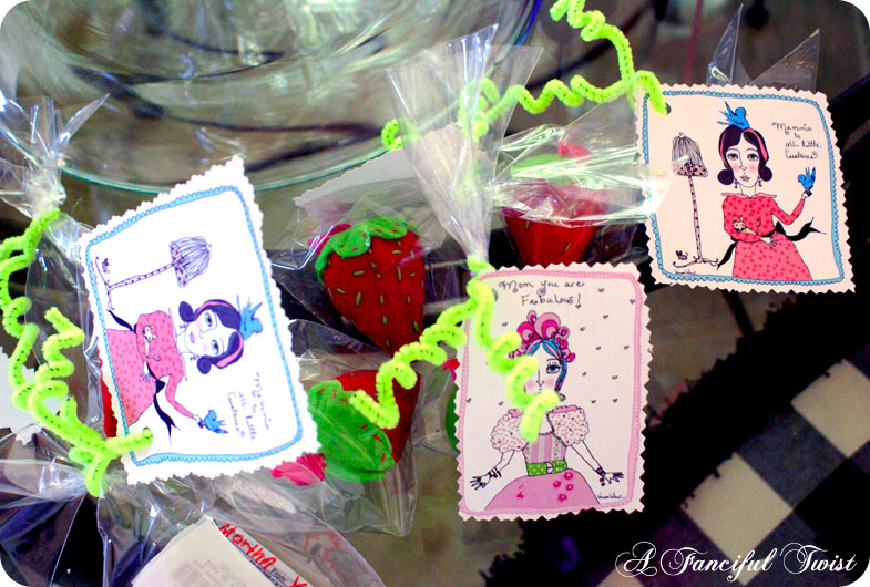 And guess what? Mombie sewed up some little strawberries she saw on Martha, and attached my little Mother’s Day cardlettes, which she printed off from a post down below… Wasn’t she a sweetie for doing that? Love it!!