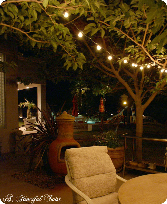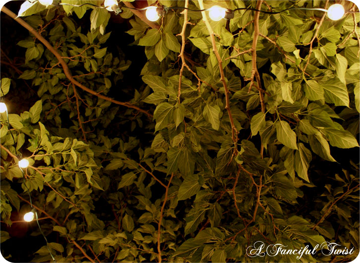 Trees intertwining above head, with lights. I just love stringing lights all about… It makes everything so dreamy at night…