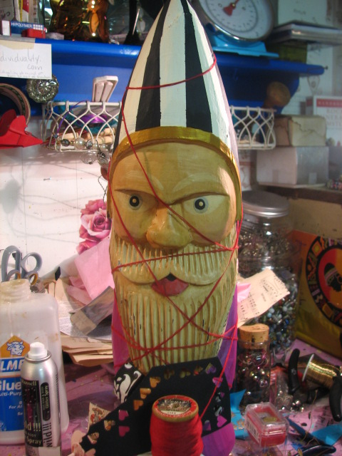 Now, the 2nd thing that happened. I caught Knowme in my studio, he had wrapped himself up in red string. And he was holding a Valentine. He said he was packaging himself up to offer himself as a Valentine to a woman. Where do you think he is going to find one trapped in Catalina???? Poor Knowme.