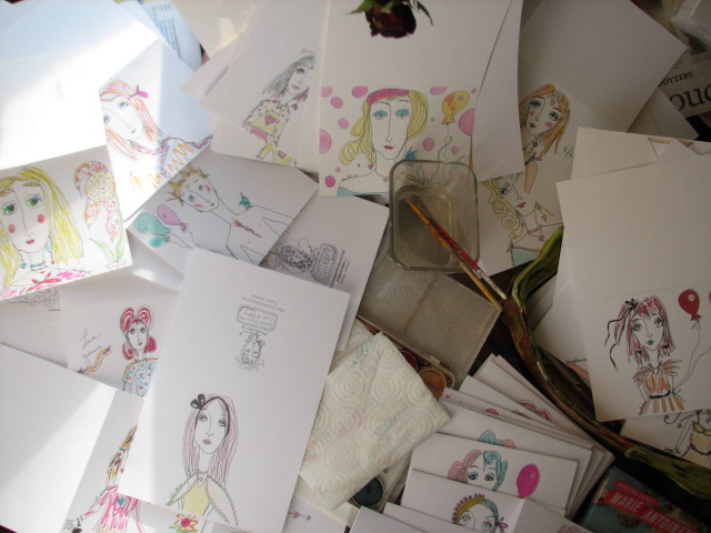 Those cards look wonderful! Incredible how you’re producing so many in such a short time. As for the film Marie-Antoinette, I liked it for the costumes and art, but you’re right, the core of the story misses the mark. As for the real Versailles, the first time I saw it, I thought it a bit obscene – all that gilt and beauty when people were starving. But then I remembered the history and how different things were then and one can understand its appeal. It’s certainly an adventure in excess, even now. The china and porcelain alone are enough to make one swoon!