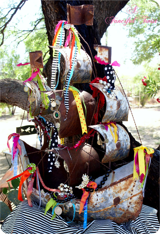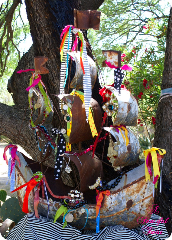 Oh my goodness, what a pirate party table. And the ship. Prefect. I can just see setting sail among all those ribbons. Clarice
