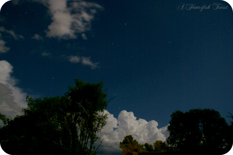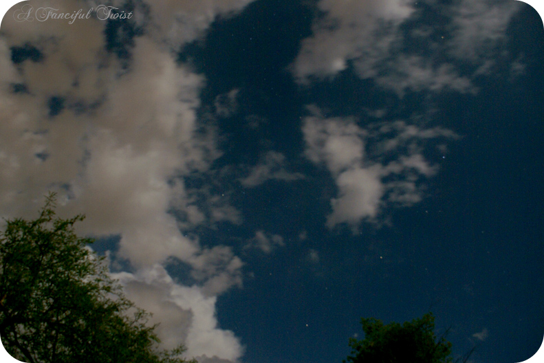 I just can not believe how astounding the clouds have been. It has been like a fake sky. Painted in by Michelangelo. Kind of like a Disneyland sky, too perfect for words… Bright white clouds, illuminated by the moon, with a sprinkling of twinkling stars. Just enough to cause a stir in the heart. Nature gives us such glorious gifts…
