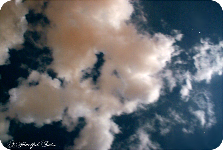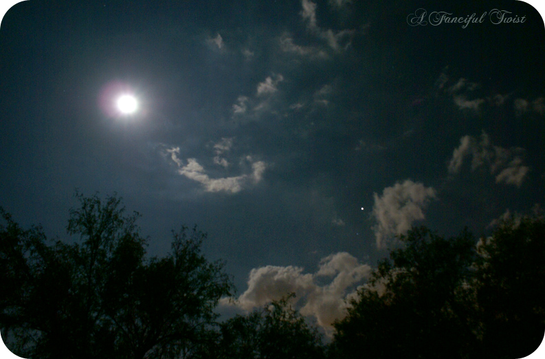 Ooooh…pretty pretty. You sure can work some magic with that camera, Miss V. THose are some of the nicest clouds I’ve seen. I always try to get the moon in all its glory, but it ends up looking like a sad, shrively dot. I’ve decided to only remember special moons in my head.