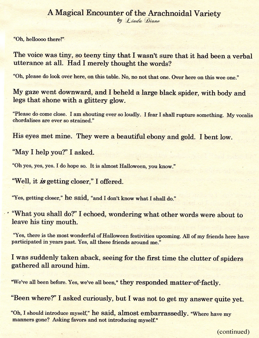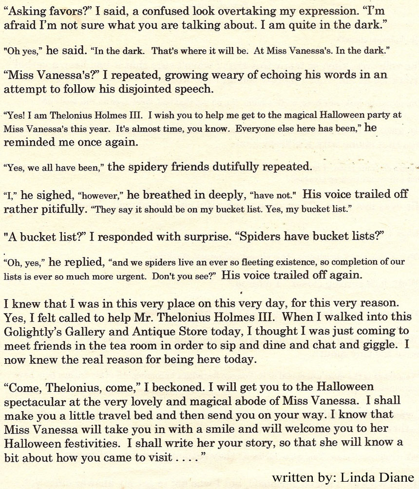 Thank you so much for telling the world the story of the most magical of spiders, my friend, Mr. Thelonius. I see he has made himself right at home, even to the point of climbing on the head of a certain Halloween guest, as noted above. Thankfully, she didn’t seem to mind. Perhaps it set the spooky party-ful mood for her all the more!