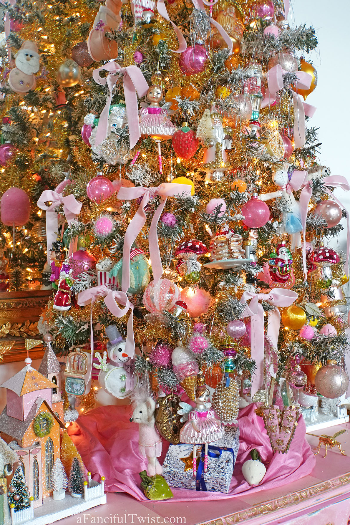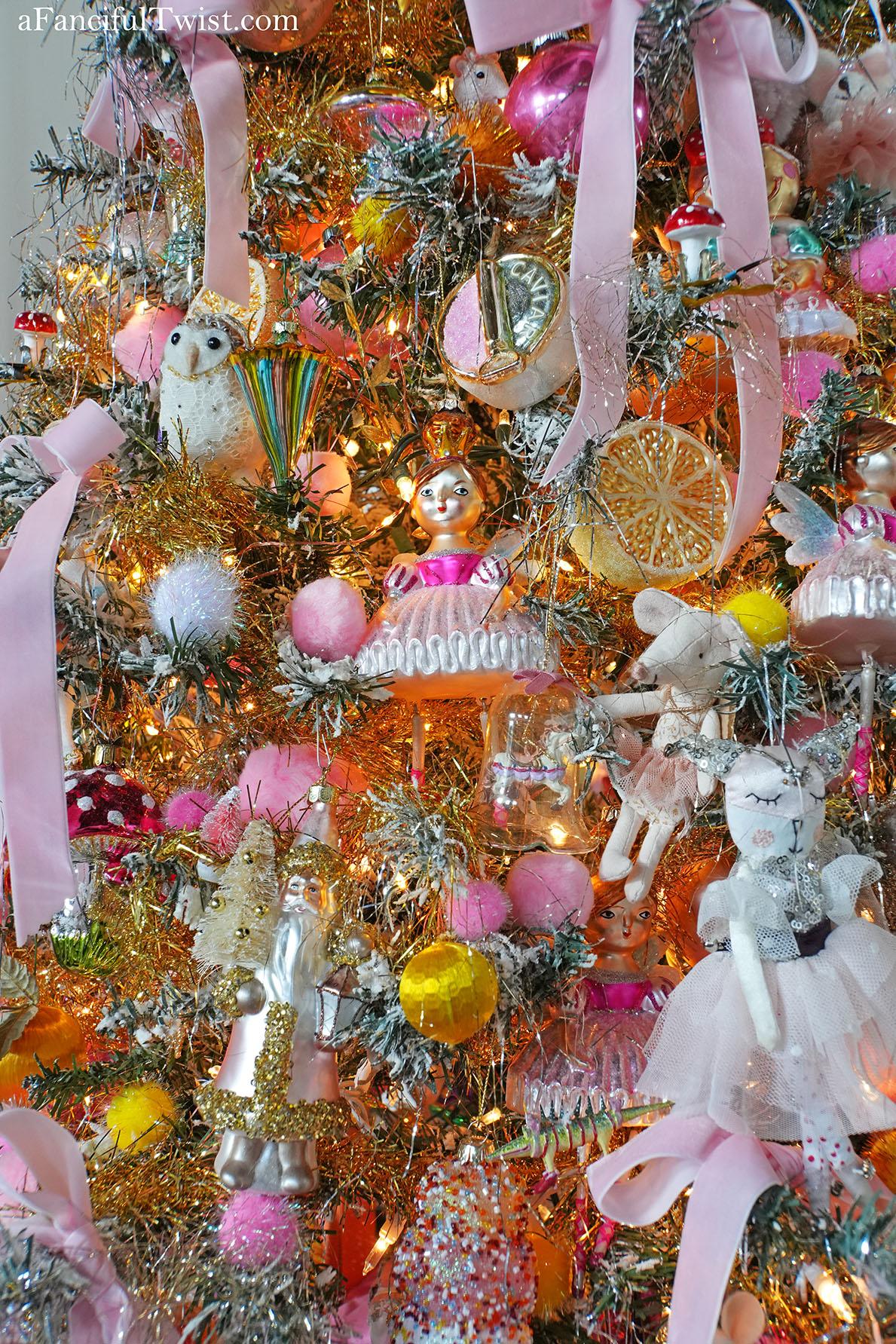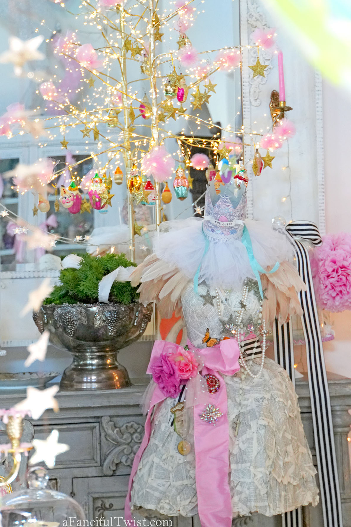 Veevala, you’ve done it again! So so mesmerizing, I don’t want to work, I just want to stare at sparkle stars and twinkle lights all day! You know what I stole from you this year? The ribbon. I love how you have these long luxurious bits of ribbon everywhere, so luscious! Speaking of – you GO Mr. Goose! Way to be celebrated in the center of the table while NOT being eaten! Love love this, and all the mystery pieces that glitter and shine on your beautiful table until you’re upon them and see that Miss Marie Antoinette lost her perfect shoe whilst dancing at midnight under the twinkle stars, with the handsome nutcracker….ohhhh so dreamy!!! And She Who Wanted To Be Painted, to me, looks like an angel with pink feathers <3 If I ever show up at your door, just let me in, I won't be a bother, I will just stare at your tree and Christmas Cabinet..or 2 trees, I should say because the one next to the Christmas cabinet is equally fabulous! Now. I can't even. This cannot be December 22nd as I write - that cannot beeeeee....we fell down a wormhole obviously, and when we pop back up it'll be Thanksgiving and we can go from there...hee hee! Kiss and hug every male you love, furry and otherwise, and blame it on the mistletoe, or those impish clowns 🙂 Love and hugs and all good things from our house to yours Veevala! xoxoxviiiroostah