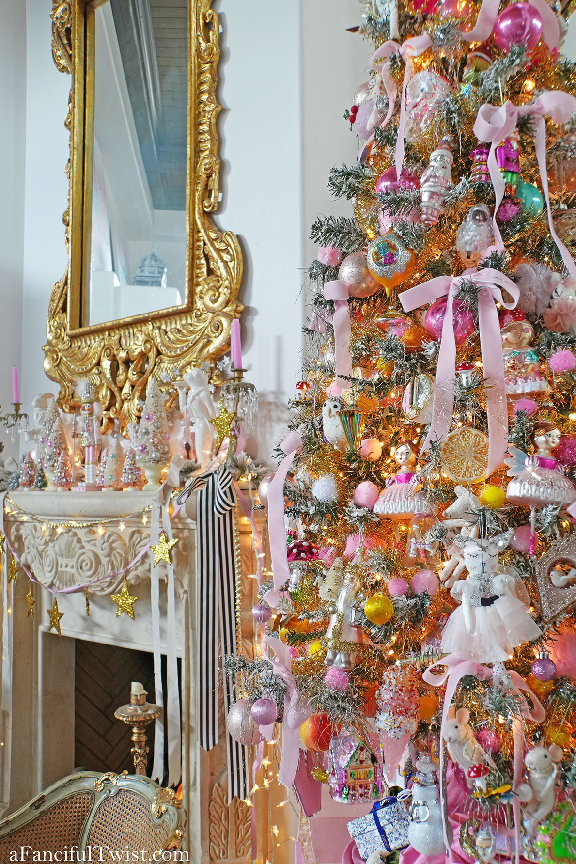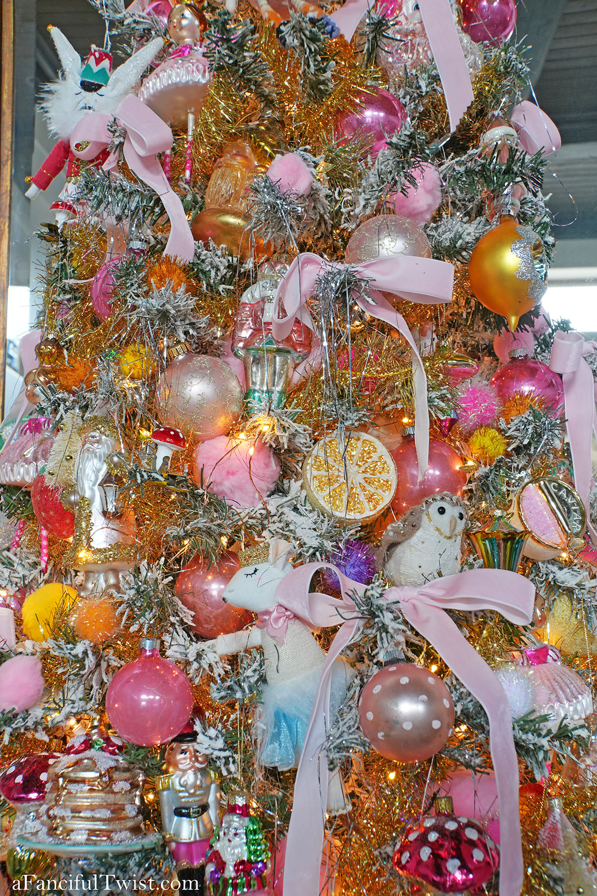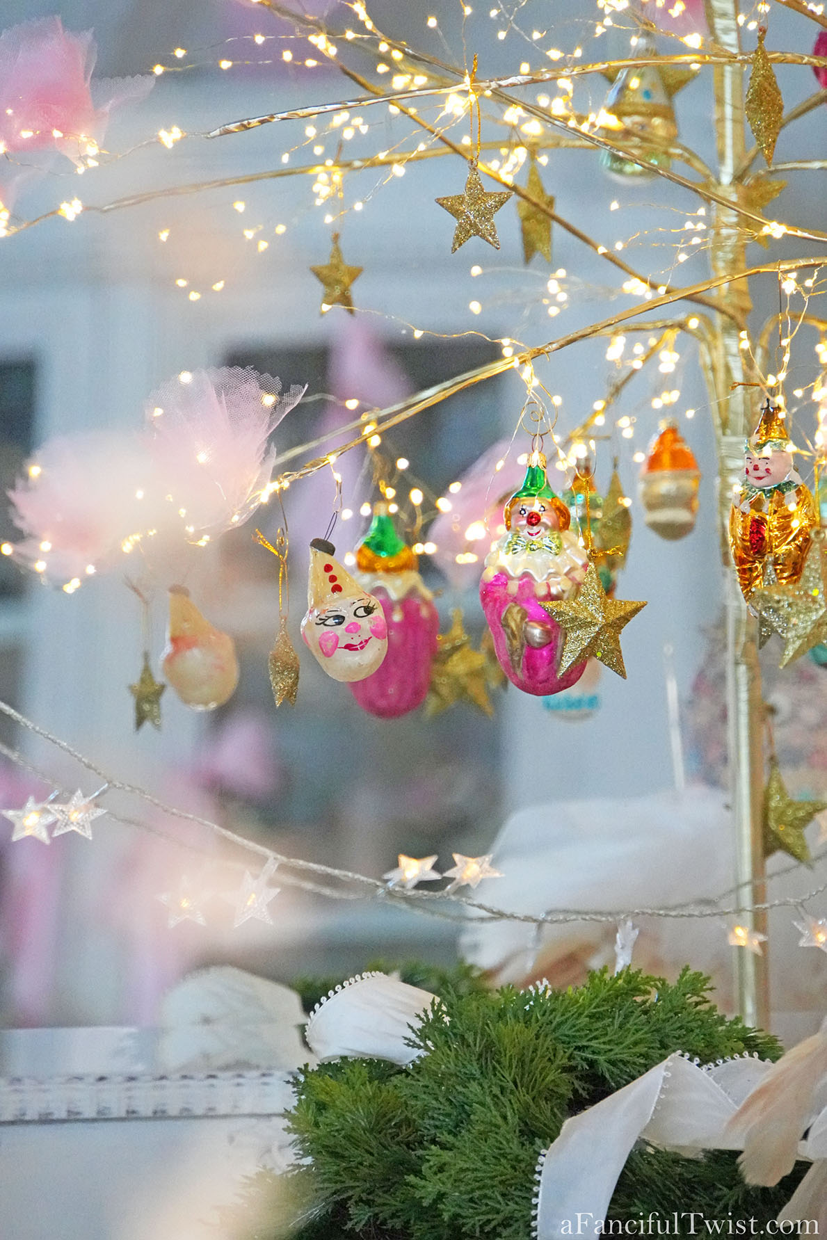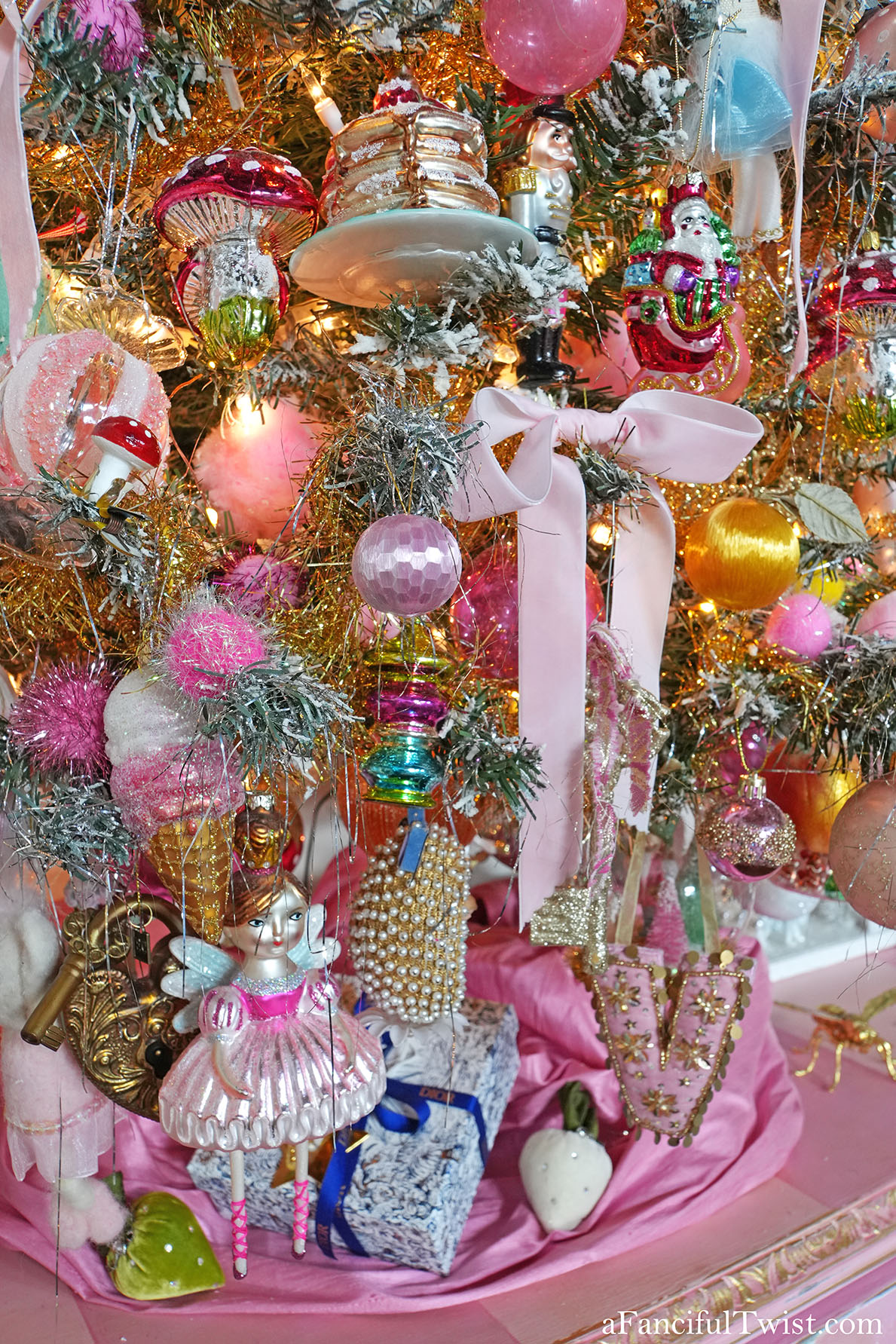 Veevala, you’ve done it again! So so mesmerizing, I don’t want to work, I just want to stare at sparkle stars and twinkle lights all day! You know what I stole from you this year? The ribbon. I love how you have these long luxurious bits of ribbon everywhere, so luscious! Speaking of – you GO Mr. Goose! Way to be celebrated in the center of the table while NOT being eaten! Love love this, and all the mystery pieces that glitter and shine on your beautiful table until you’re upon them and see that Miss Marie Antoinette lost her perfect shoe whilst dancing at midnight under the twinkle stars, with the handsome nutcracker….ohhhh so dreamy!!! And She Who Wanted To Be Painted, to me, looks like an angel with pink feathers <3 If I ever show up at your door, just let me in, I won't be a bother, I will just stare at your tree and Christmas Cabinet..or 2 trees, I should say because the one next to the Christmas cabinet is equally fabulous! Now. I can't even. This cannot be December 22nd as I write - that cannot beeeeee....we fell down a wormhole obviously, and when we pop back up it'll be Thanksgiving and we can go from there...hee hee! Kiss and hug every male you love, furry and otherwise, and blame it on the mistletoe, or those impish clowns 🙂 Love and hugs and all good things from our house to yours Veevala! xoxoxviiiroostah