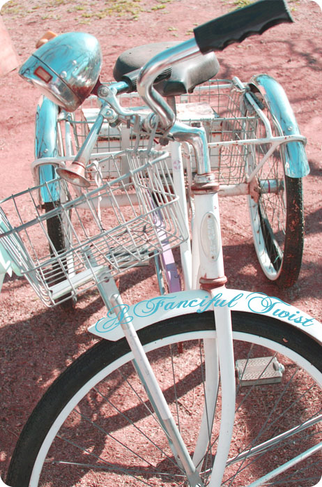 I am in serious like with your sadly-flatted 3 wheeled bicycle. My grandmother had one like that with big double wire baskets on the back. She carried her groceries home in it and sometimes even rode it to church in her Granny-Sunday clothes.