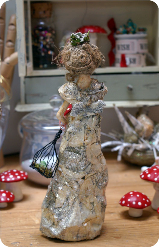 Little sister Charlotte, is a darling girl… She will join the shop as well, with her little birdcage (with a teeny tiny bird in it) that I made out of a flattened bottle cap and wire… (she also carries a mushroom with her) I think Charlotte, is a collector of sorts, wouldn’t you say?