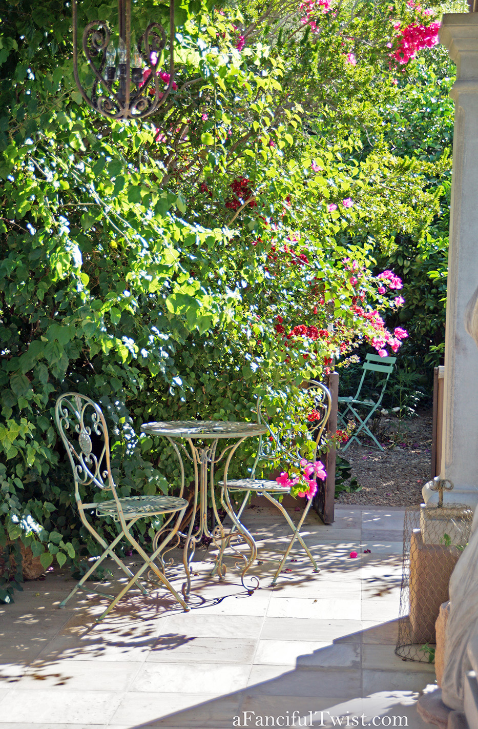 There is shade from all the growth of the trees and roses due to all the rain, which creates a positively moody ambience.