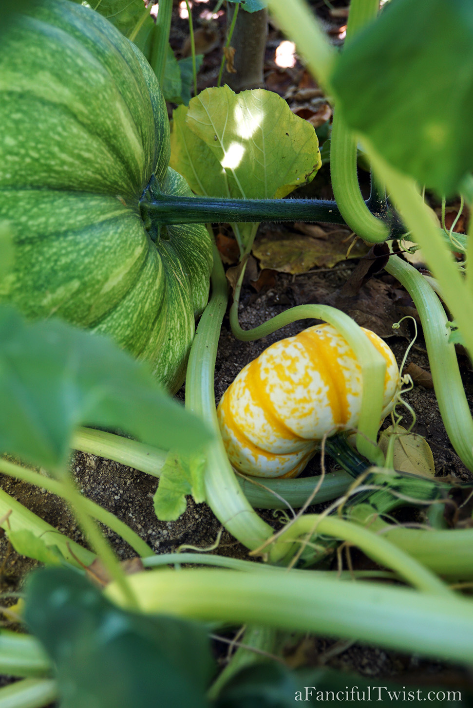 I peeked under giant thorny pumpkin leaves, like parasols made just for pumpkin babes.