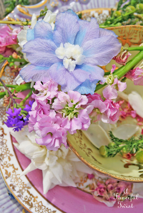 I gather pretty tea things to take with me as I hide under the purple canopy and sip.