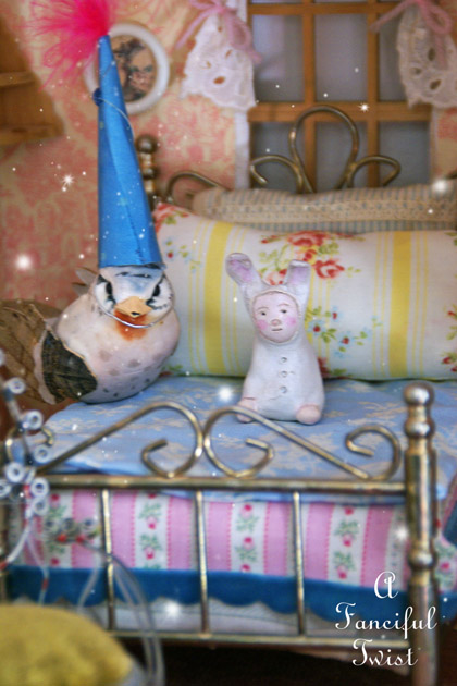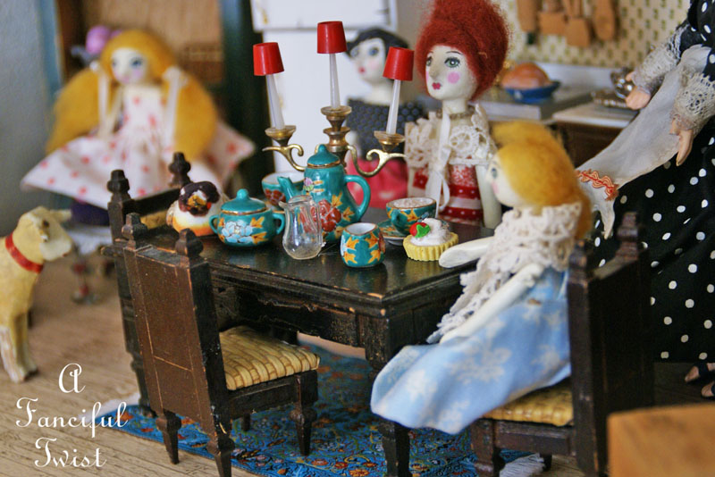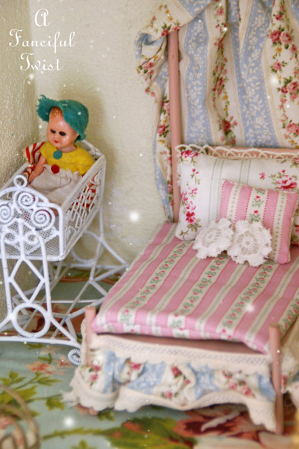 I adore your doll house and the collection of dollies you have. And I have some of the same fabric you have used for the bedding and other goodies. We do have good taste, don’t we? 😉 smiles.