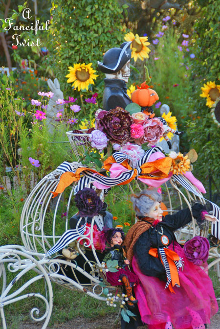 I loved every bit of your Witches tea! Such fabulous characters attended in such grand style in this magnificent carriage! Wherever do you find such fascinating collectibles! That gnome in the dog costume gave me such a giggle!!! Your table divine with your spectacular black and white dishes and soft pastel palette decor!