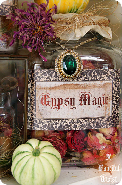 Every spring/summer I save as many flowers as I can, and I dry them. This large container below houses the sweetest smelling roses, which I actually saved last year. I used the tutorial for the lid I shared here, and then sprinkled some magenta glitter into the jar for effect. I hung an antique necklace around the jar, and voila Gypsy Magic.
